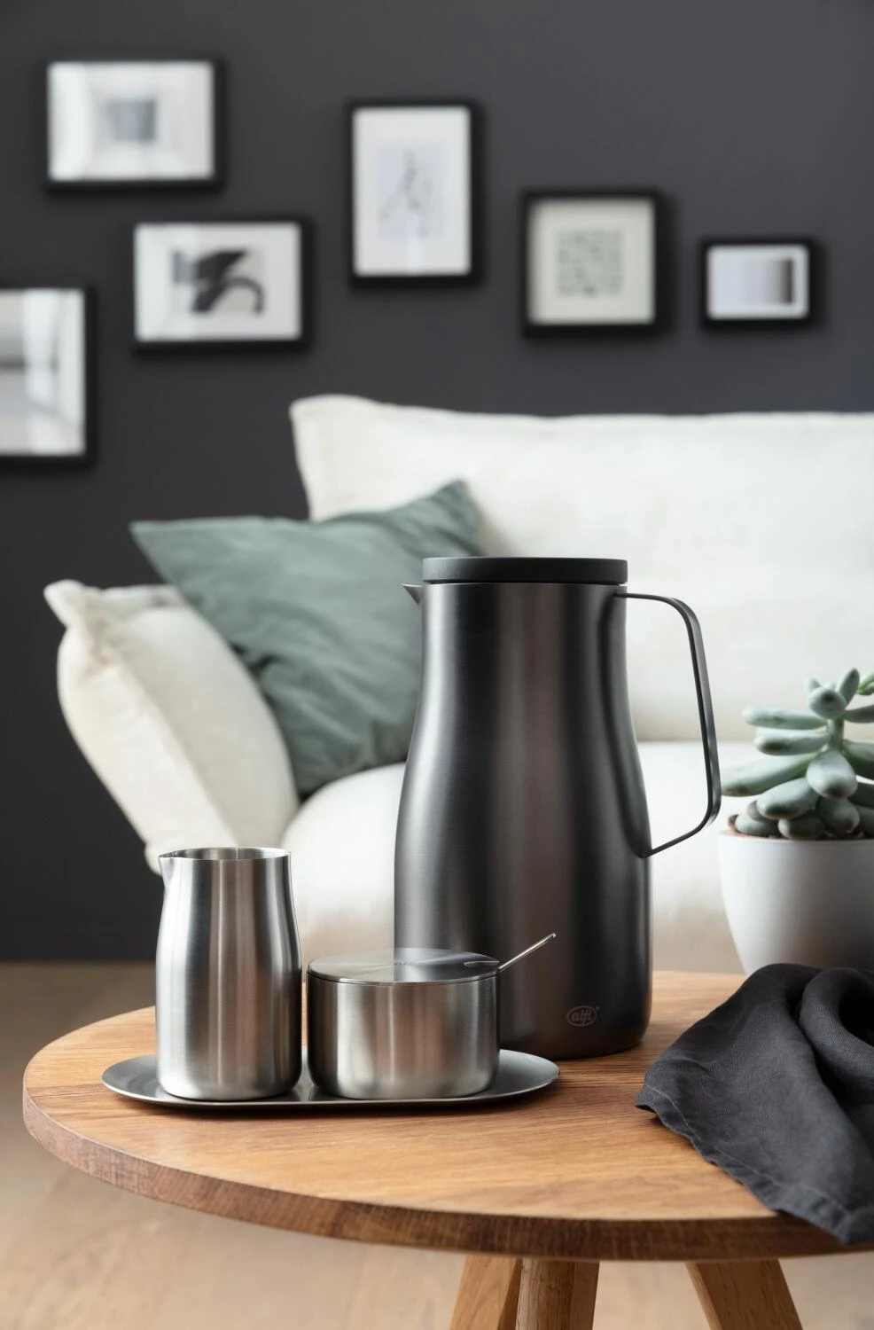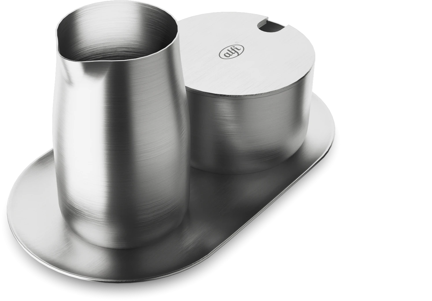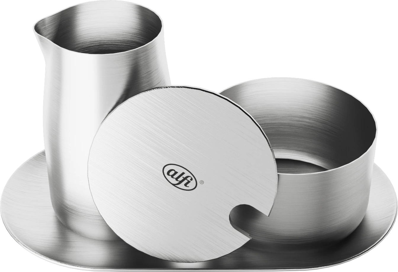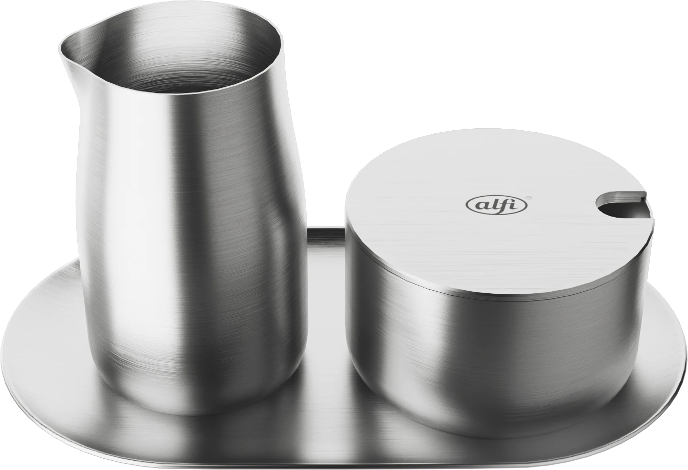 alfi besteht aus einem Tablett, dem Milchkännchen und einer Zuckerdose mit Deckel. Es macht einen formschönen und hochwertigen Eindruck am Buffet, im Büro oder auf der Kaffeetafel. Die Zuckerdose ist mit einer praktischen Öffnung für einen Löffel versehen. Das Milchkännchen verfügt über eine speziell geformte Tülle, die das Ausgießen von Milch oder Sahne erleichtert.