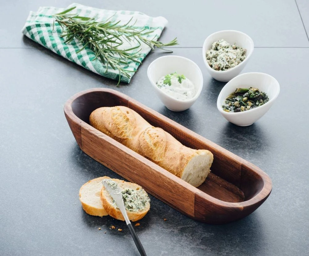Auf der schlanken Holzschale wird Baguette appetitlich serviert. Auch als Dekorationsschale nutzbar.