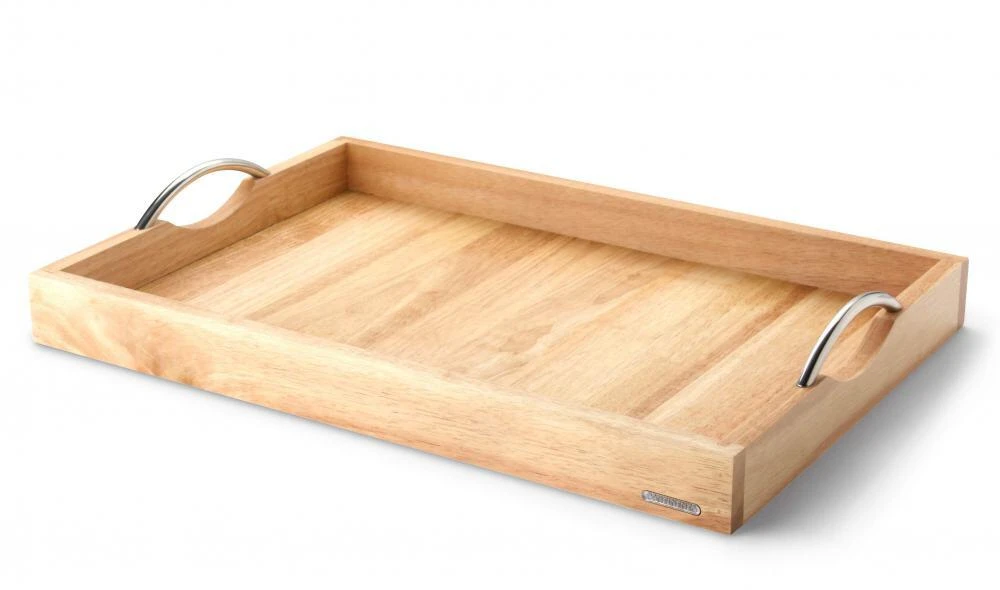 Tablett aus Gummibaumholz mit Metallgriffen. Das Holztablett in exklusivem Design.