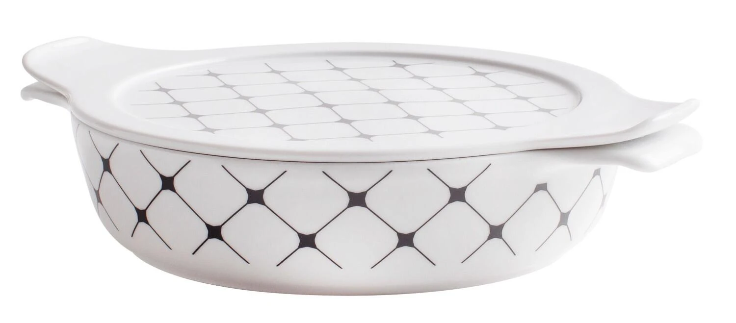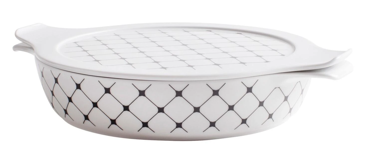 Eschenbach flacher Topf mit Deckel Cook & Serve in square. Zum Zubereiten, Erwärmen, Kochen, Backen, Grillen und Aufbewahren Ihrer Speisen in nur einem Kochgeschirr aus Porzellan. Im modernen schwarz-weiß Design.