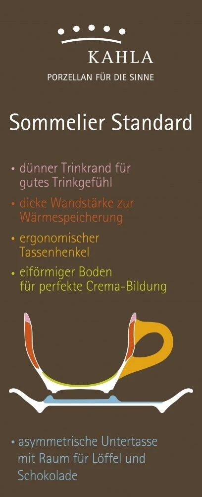 Bei der Entwicklung der Kollektion Café Sommelier wurde auf Details wie Größe, Wandstärke, Rand- und Innenform der Tassen geachtet, um einen optimalen Geschmack zu ermöglichen. So sorgt der dünne Mundrand für ein gutes Trinkgefühl. Die kräftige Wandstärke speichert die Wärme und hält den Espresso lange heiß. Die gerundete Innenform („Eiform“) der Tasse sorgt bei Kaffee aus der Espressomaschine für die perfekte Crema und ist angenehm beim Umrühren. Die Henkel sind so geformt, dass die Tassen bequem gegriffen und während des Trinkens mühelos in jeder Position gehalten werden können. Dazu kommen eine klassisch-elegante, harmonische Erscheinungsform, stabiler Halt auf der Untertasse und eine asymmetrische Untertasse, die viel Platz für Löffel und Schokolade bietet.