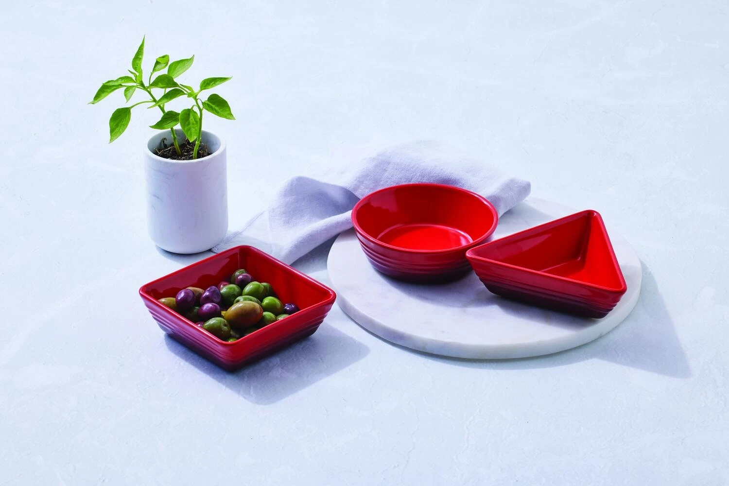 Le Creuset Tapasschälchen 3er Set in kirschrot. Tapas-Set in drei verschiedenen Formen für die Zubereitung und zum Servieren von kleinen Speisen.