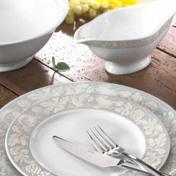 Pillivuyt Teller flach Eclectique Bordeaux in weiß. Die Serie Eclectique wurde im 19. Jahrhundert entwickelt und präsentiert sich in weiß und eleganten Grautönen, die in Kombination miteinander besonders gut zur Geltung kommen.
