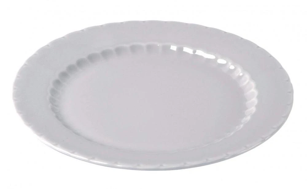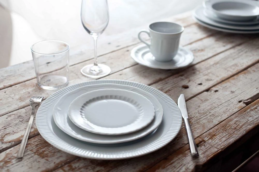 Pillivuyt Teller flach Eclectique Sarlat in taubengrau. Die Serie Eclectique wurde im 19. Jahrhundert entwickelt und präsentiert sich in weiß und eleganten Grautönen, die in Kombination miteinander besonders gut zur Geltung kommen.