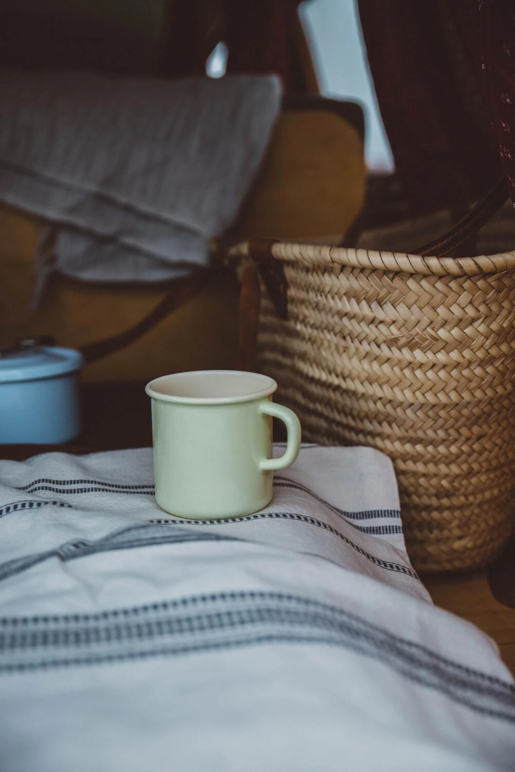 Riess Becher aus Emaille in nilgrün. Trinkbecher mit Griff und Bördelrand aus Emaille, ideal für Tee, Kaffee und andere Heiß- oder Kaltgetränke. Warme Getränke können direkt in der Tasse auf dem Herd erwärmt werden.