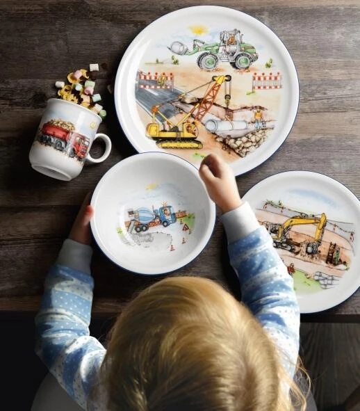 Seltmann Weiden Geschirrserie Compact ist mit ihrer runden, schlichten Form perfekt geeignet für junge Gourmets. Das Porzellan lässt sich gut greifen und ist auch nach einem ausgiebigen Schmaus ganz leicht in der Spülmaschine zu reinigen. Lustige Motive wie „Auf der Baustelle“ sorgen für Begeisterung bei Groß und Klein.