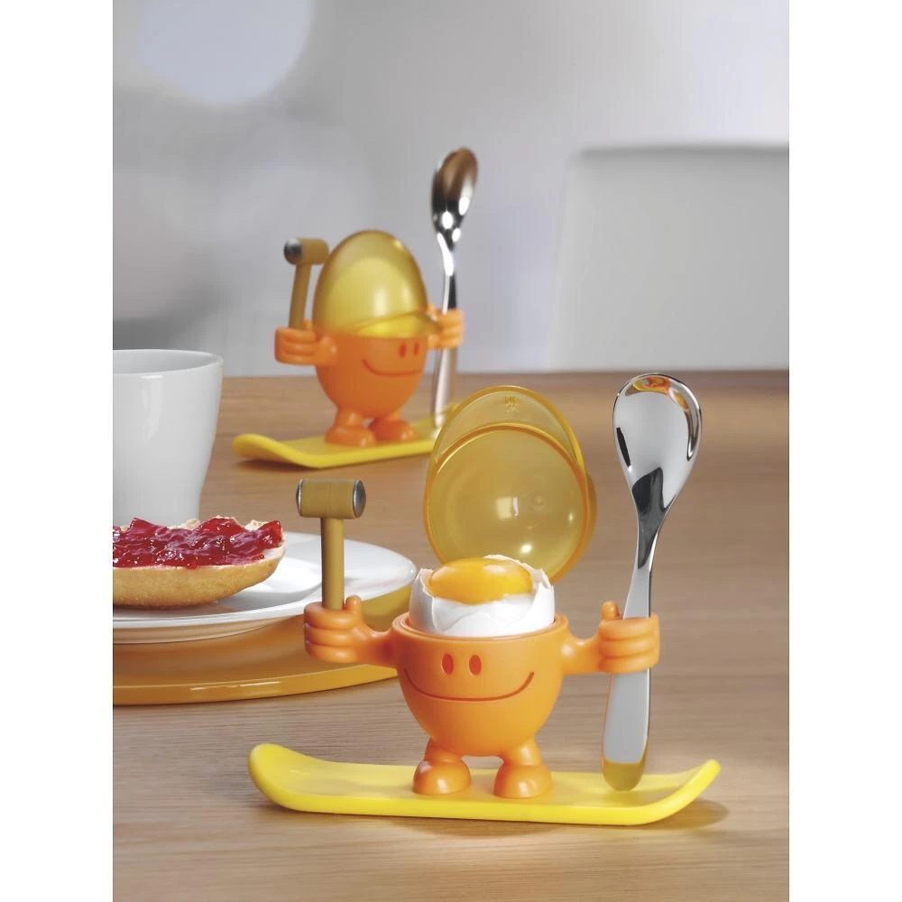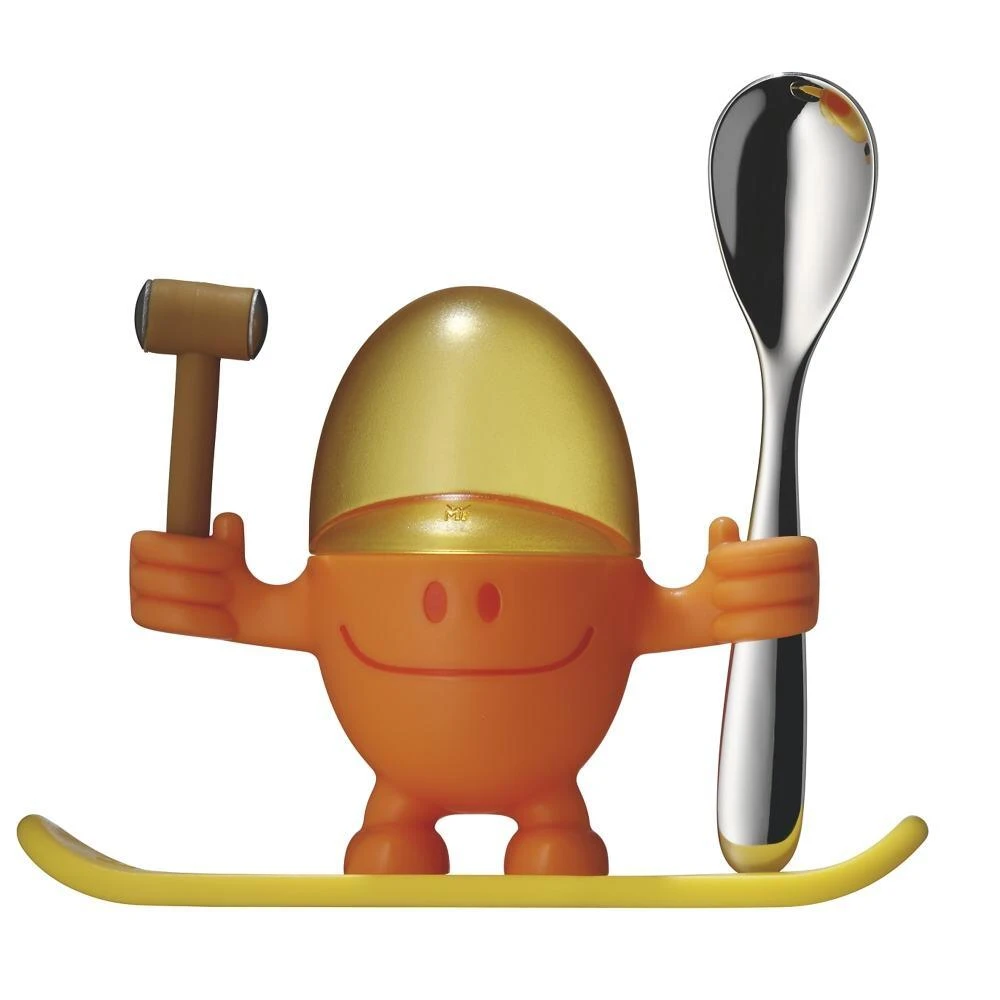 WMF Eierbecher McEgg orange. McEgg – der freche Eierbecher für Kinder. Der Eierbecher steht bereit mit Hammer und Eierlöffel für den Frühstücksstart! In der Kappe von McEgg können die Eierschalen gesammelt werden. Der Eierbecher “MCEgg ” ist auch in blau, in rot mit FC Bayern München Motiv und als Fußball “McEgg ” erhältlich.