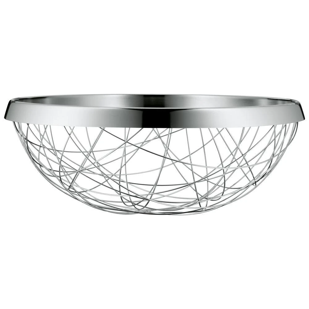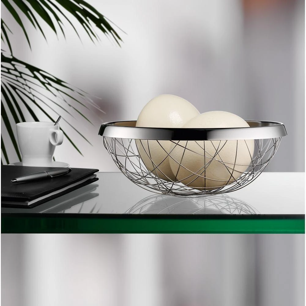 WMF Korb Chaos. Die filigranen Drahtgeflechte wirken mit und ohne Inhalt als Blickfang. Der breite Edelstahlrand und die gebogenen Drähte bilden einen spannungsvollen Kontrast. Nur erstklassiges Material und sorgfältige Verarbeitung sorgen fürFormbeständigkeit. Ein Attraktiver Drahtkorb mit 27 gebogenen Drähten, handgefertigt mit sicherem Stand. Der Rand des Korbes ist mattiert, die Drähte poliert.
