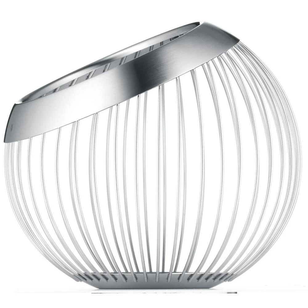 WMF Korb Lounge, klein. Die filigranen Drahtgeflechte wirken mit und ohne Inhalt als Blickfang. Der breite Edelstahlrand und die gebogenen Drähte bilden einen spannungsvollen Kontrast. Nur erstklassiges Material und sorgfältige Verarbeitung sorgen für Formbeständigkeit. Durch die nach vorne gebeugte Form ist ein leichtes Entnehmen möglich und dadurch ideal für Obst und Zitrusfrüchte geeignet.